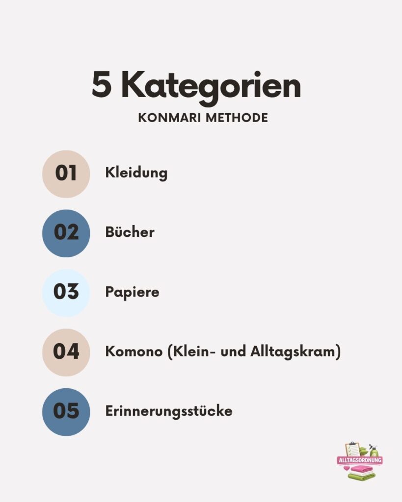 💠 alle 5 Kategorien ausführlich erklärt: Kleidung, Bücher, Papiere, Komono und Erinnerungsstücke.